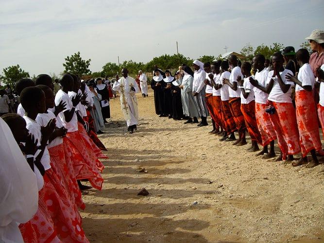 As nove em ponto deram início à cerimônia da Dedicação e Benção do Mosteiro “Santo Agostinho” com a procissão de entrada. Na porta do templo o bispo Harrington deu as boas-vindas em inglês e em turkana. Em seguida abençoou as dependências do mosteiro e a todo o povo reunido para a ocasião.