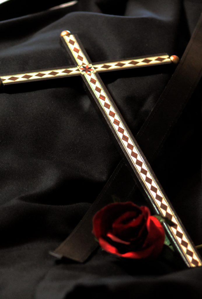 Detalle de la cruz, la rosa y la correa que lleva la imagen.