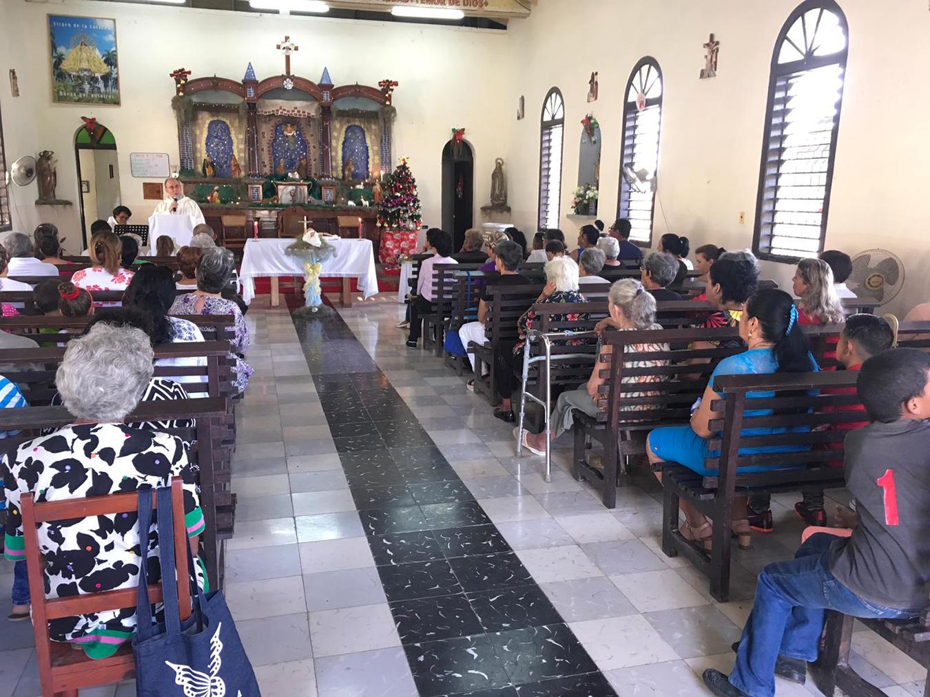 La comunidad de agustinos recoletos de Antilla está compuesta por cuatro religiosos: Jairo, colombiano; Joel, filipino; Ismael, guatemalteco, y Noé, mexicano. El 23 de diciembre celebré la misa por la mañana en Antilla. Allí un grupo de jóvenes acólitos, chicos y chicas, se esfuerzan por dar solemnidad a la celebración. Por la tarde acompañamos a Joel para celebrar la misa en la comunidad de El Ramón. Acudieron una veintena de personas. Como allí no hay iglesia la celebración la tuvimos bajo un cobertizo decorado con luces navideñas y un pequeño belén.