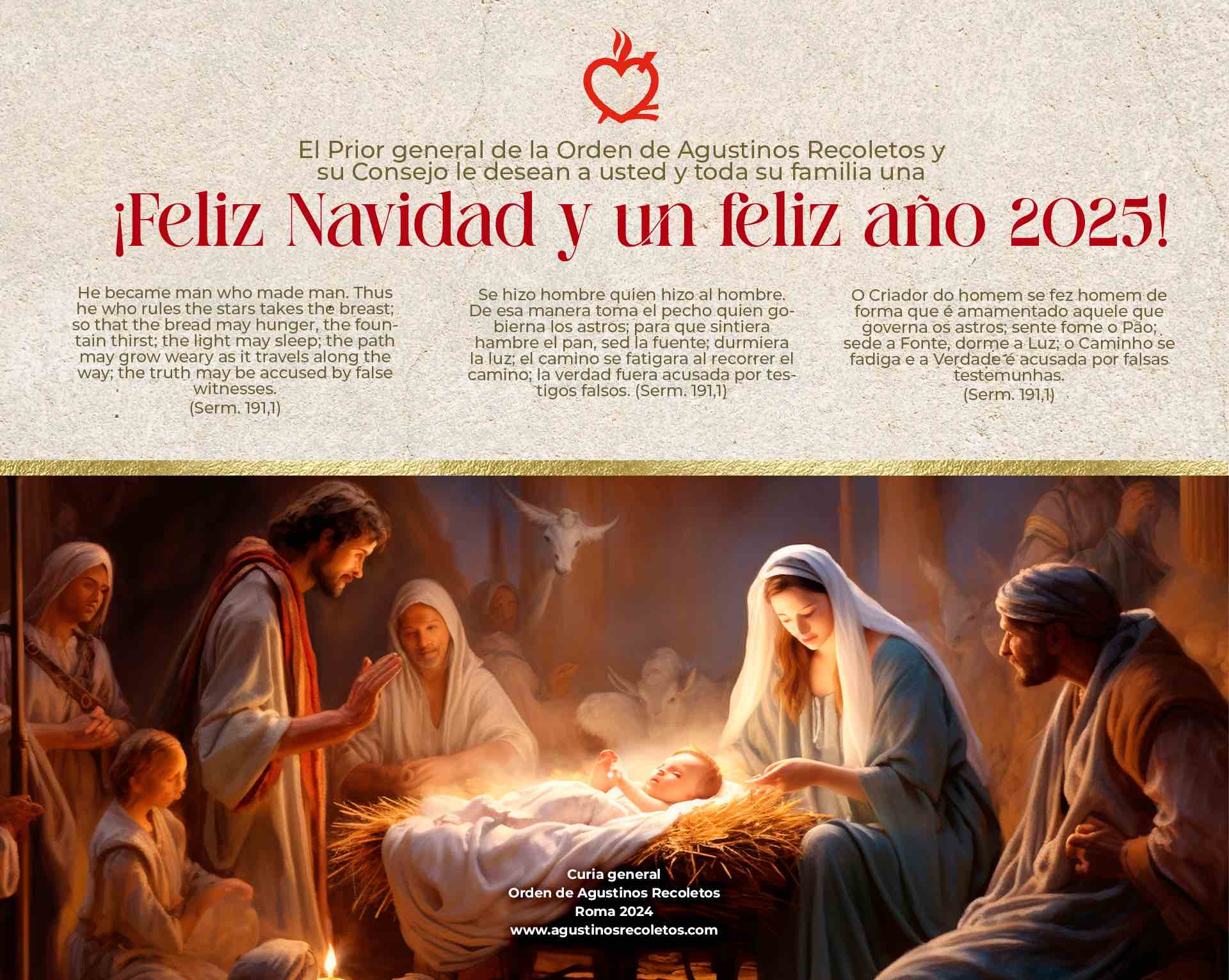 Con motivo de la llegada de la Navidad, el Prior general de la Orden, Fr. Miguel Ángel Hernández, se dirige a toda la Familia agustino recoleta con su mensaje de felicitación. Fr. Miguel Ángel nos invita a contemplar con renovada alegría y esperanza el nacimiento de Jesús-Enmanuel, el Salvador que germinó en medio de la humanidad. Tras haber recorrido el Adviento clamando “¡Cielos, lloved vuestra justicia, ábrete, tierra y haz germinar al Salvador!”, llega el momento de la celebración en el que recordamos que nuestra tierra, aunque a veces parezca árida, está siempre fecundada por la gracia de Dios.