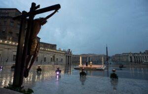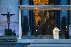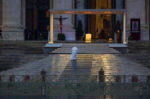 “Caminhei por uma Praça de São Pedro vazia, brilhando com a chuva na Statio Orbis, para responder à pandemia da COVID com a força da oração, da compaixão e da ternura…. Caminhei sozinho e em meu coração carreguei a solidão de todos, pude sentir seus passos nos meus, seus pés em meus sapatos, eu poderia dizer. Naquele silêncio, senti milhões de súplicas e uma necessidade universal de esperança ressoando. Chegou a ‘noite’ (Mc 4:35), a hora da tempestade, a hora de desmascarar seguranças falsas e supérfluas, e todos juntos nos vimos agarrados como uma âncora àquele Cristo que é capaz de vencer o medo, de oferecer apoio…”.