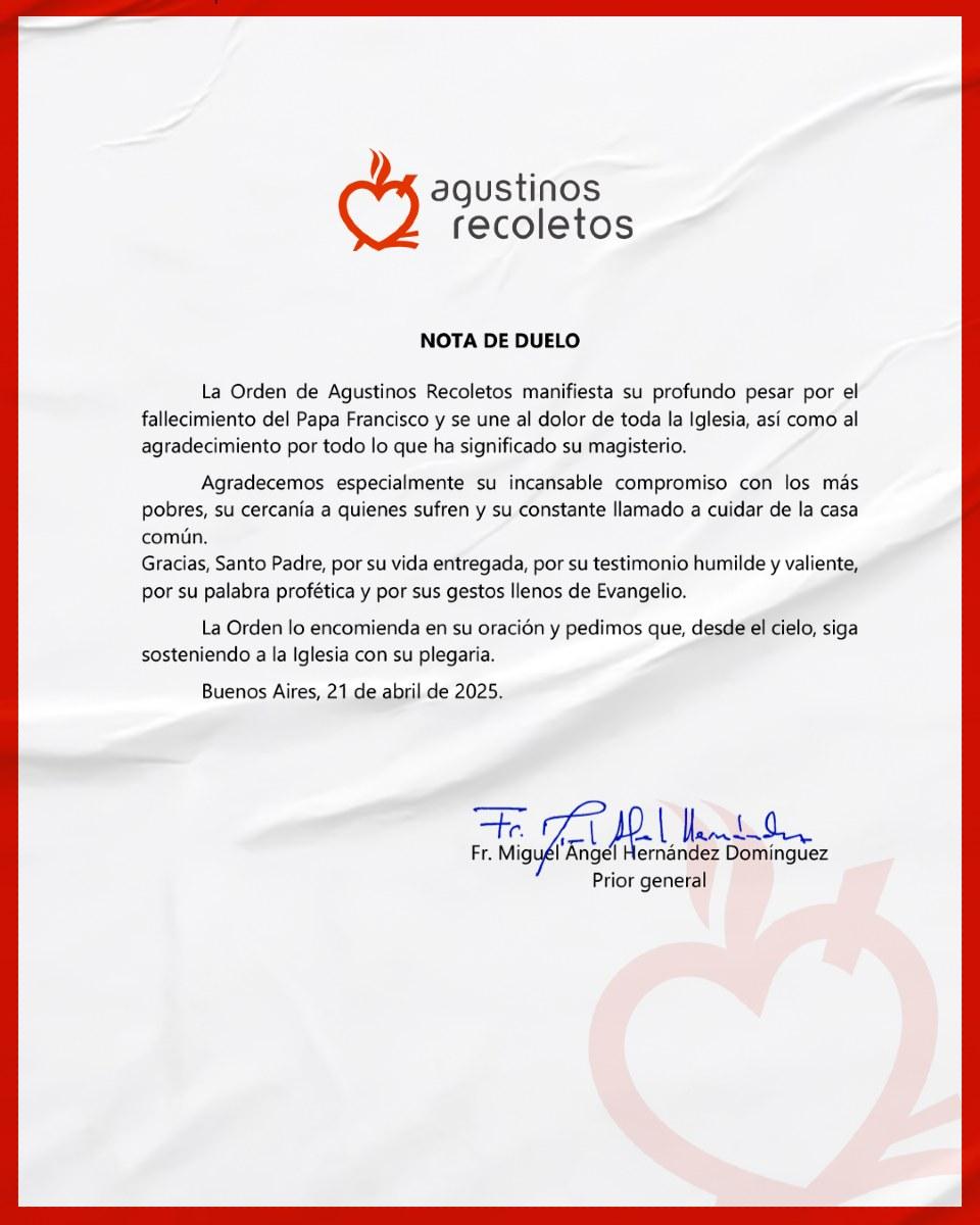 Após a morte do Papa Francisco, o Prior Geral da Ordem dos Agostinianos Recoletos, Frei Miguel Ángel Hernández Domínguez, emitiu uma nota de pesar na qual expressa sua profunda dor, se une à dor da Igreja e agradece ao pontífice por seu legado de fé, proximidade e compromisso evangélico.